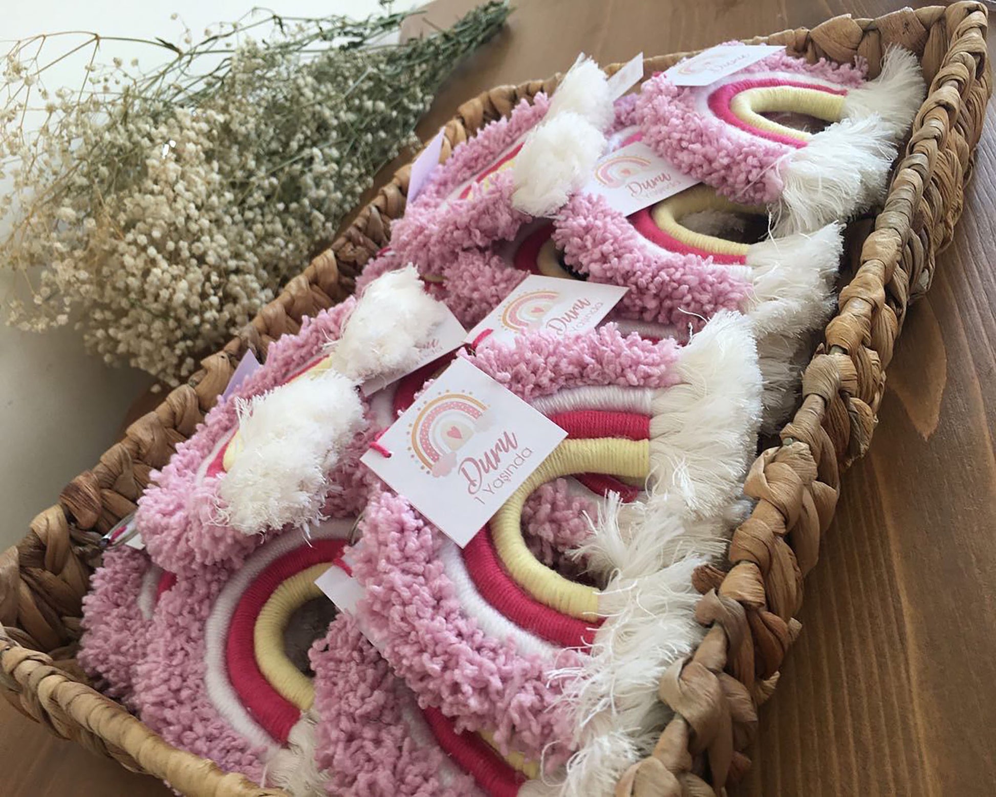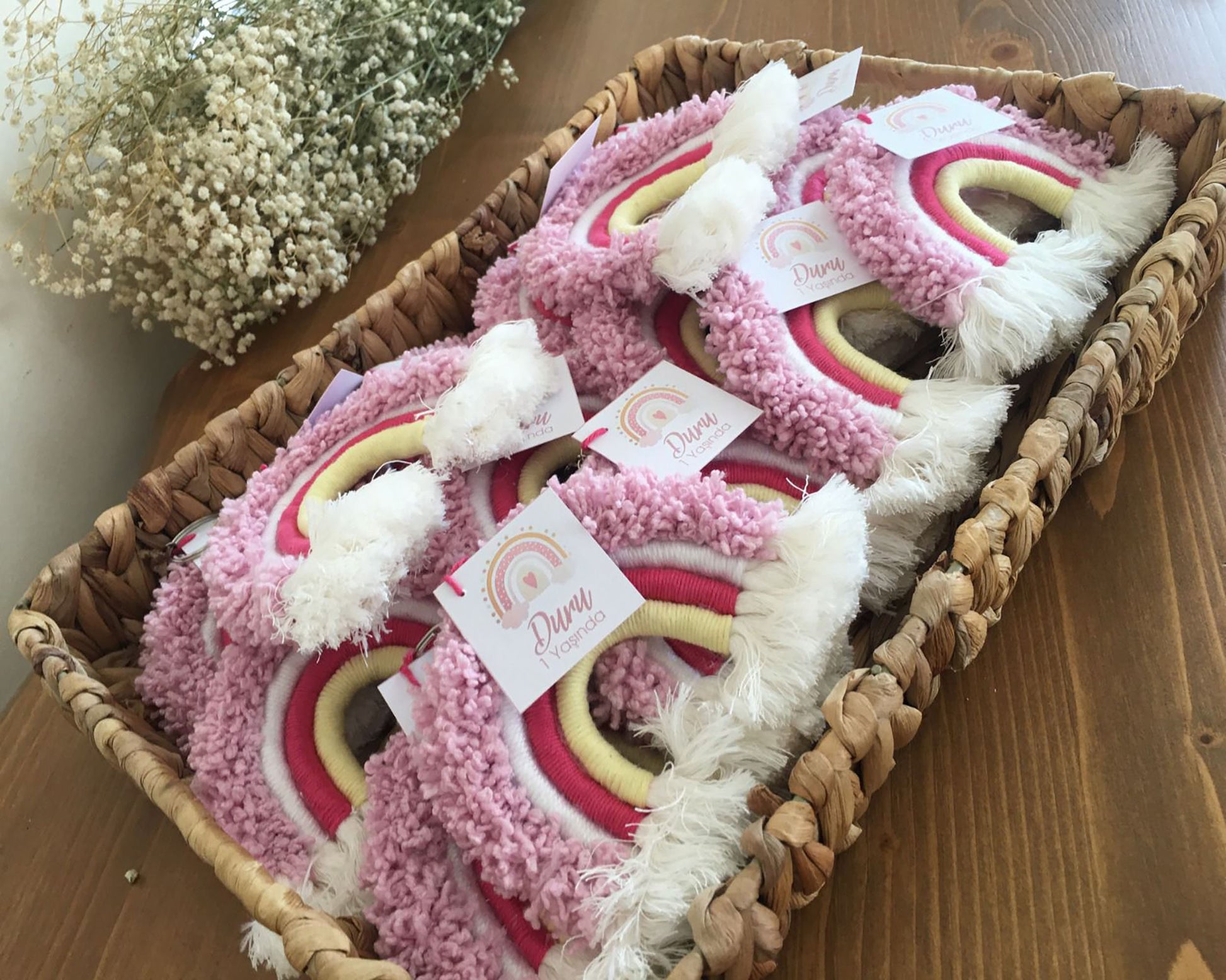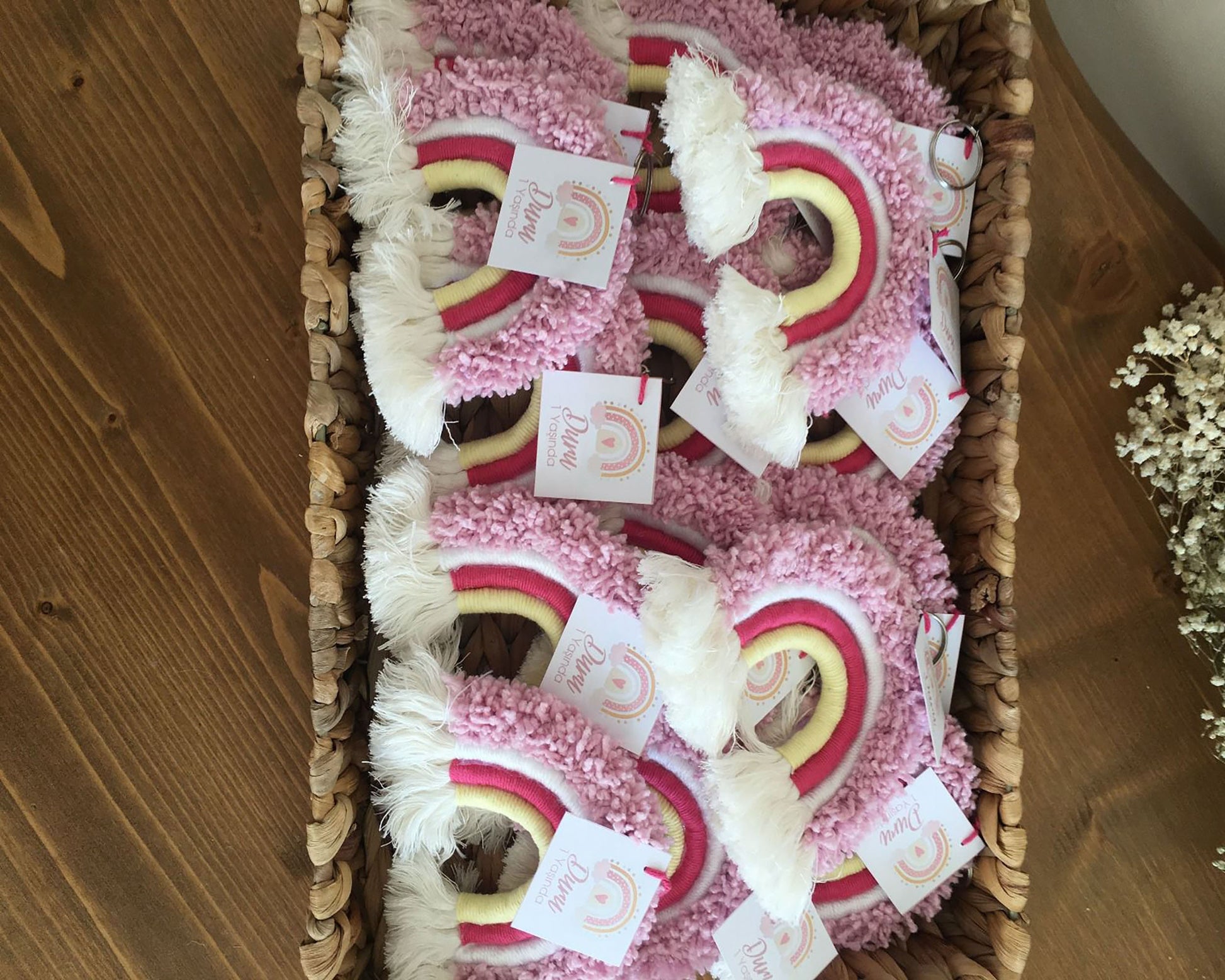 Looking for a unique and rainbow-shaped pink macrame keychain? Look no further than Uniq Favors! Our keychains are handmade with 100% cotton yarn, making them a perfect gift for baby showers, baptisms, or baby birthdays. You can also use them in party themes such as princess or unicorn concepts. Plus, the name tag on paper is created in the desired color and model.