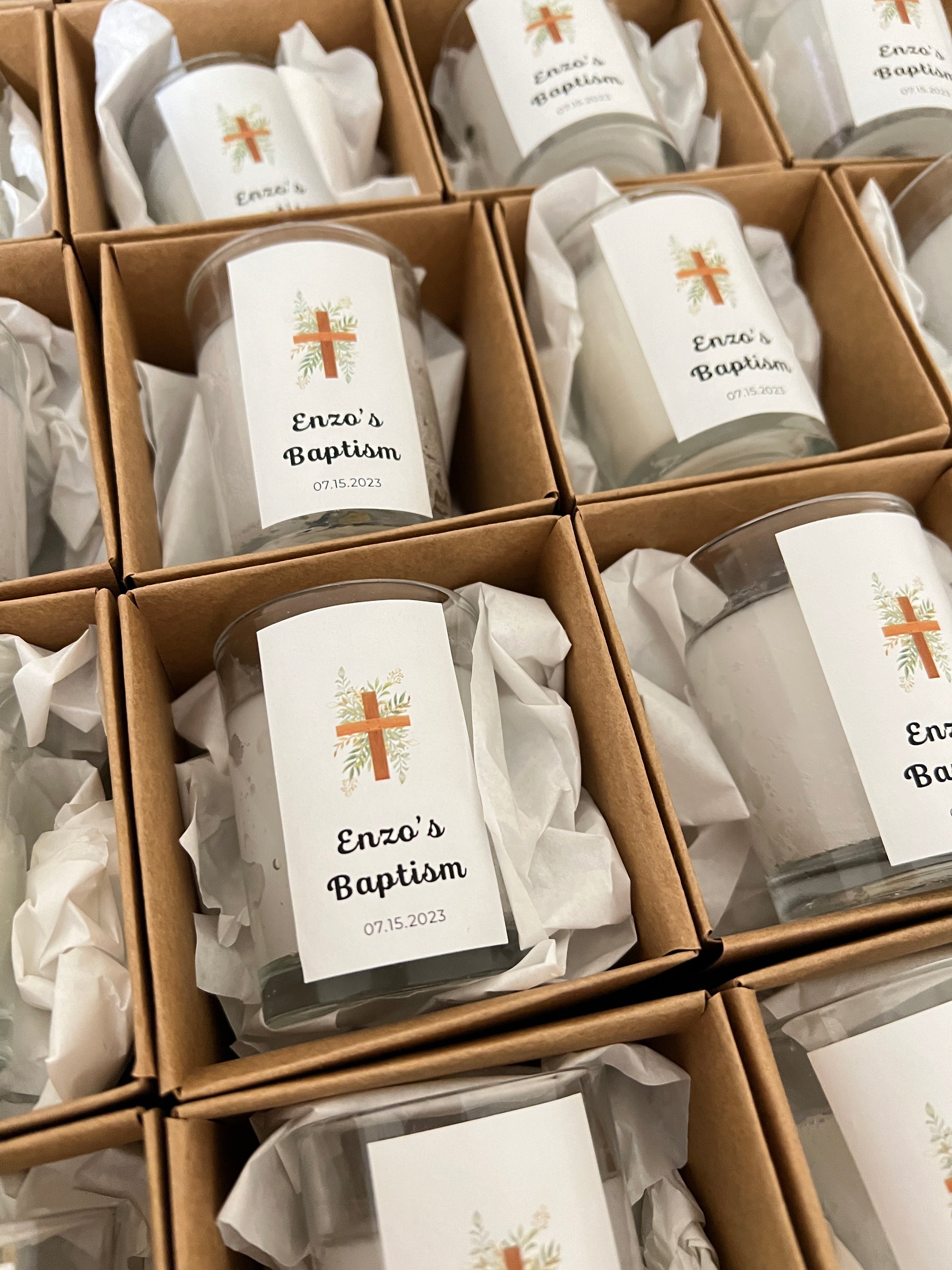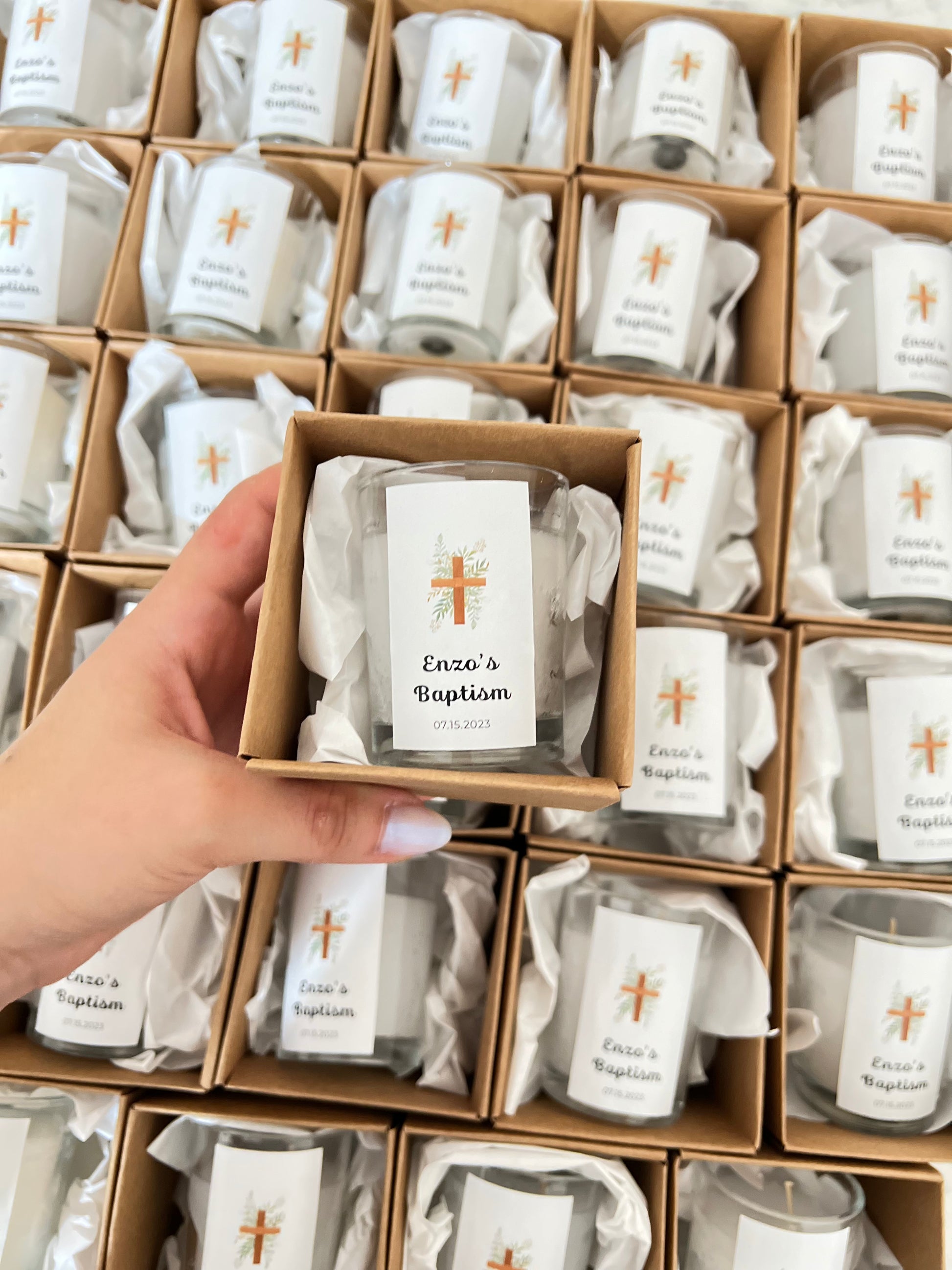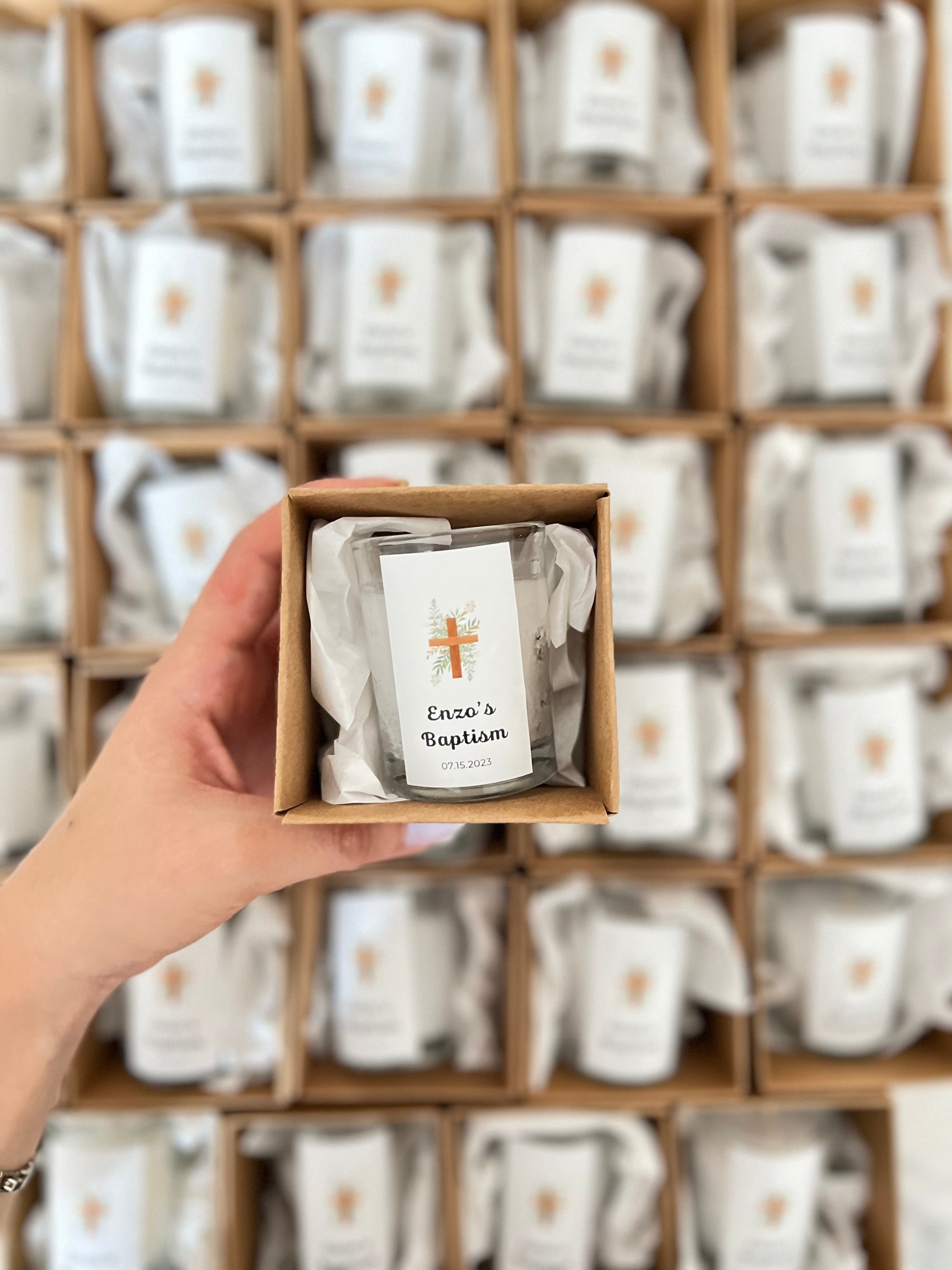 Celebrate the special occasion of a baptism with our unique and personalized souvenirs for guests. Our Baptism Party Glass Candle Favors are the perfect keepsake for your loved ones, as they come in a beautiful box and are customized with the name of the child, the date of the baptism, and a special message. These favors are also suitable for First Communions and Mi Bautizo celebrations. Our high-quality materials and attention to detail ensure that our baptism souvenirs make a lasting impression on your guests. Make your event truly memorable by choosing from our selection of designs for both girls and boys. In addition, these souvenirs are practical and make great baptism gift ideas. Don't miss out on the opportunity to make your event extra special with our Baptism Party Glass Candle Favors.
