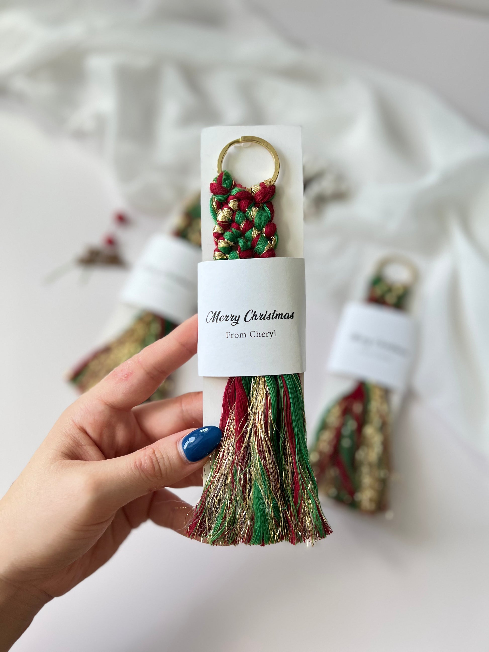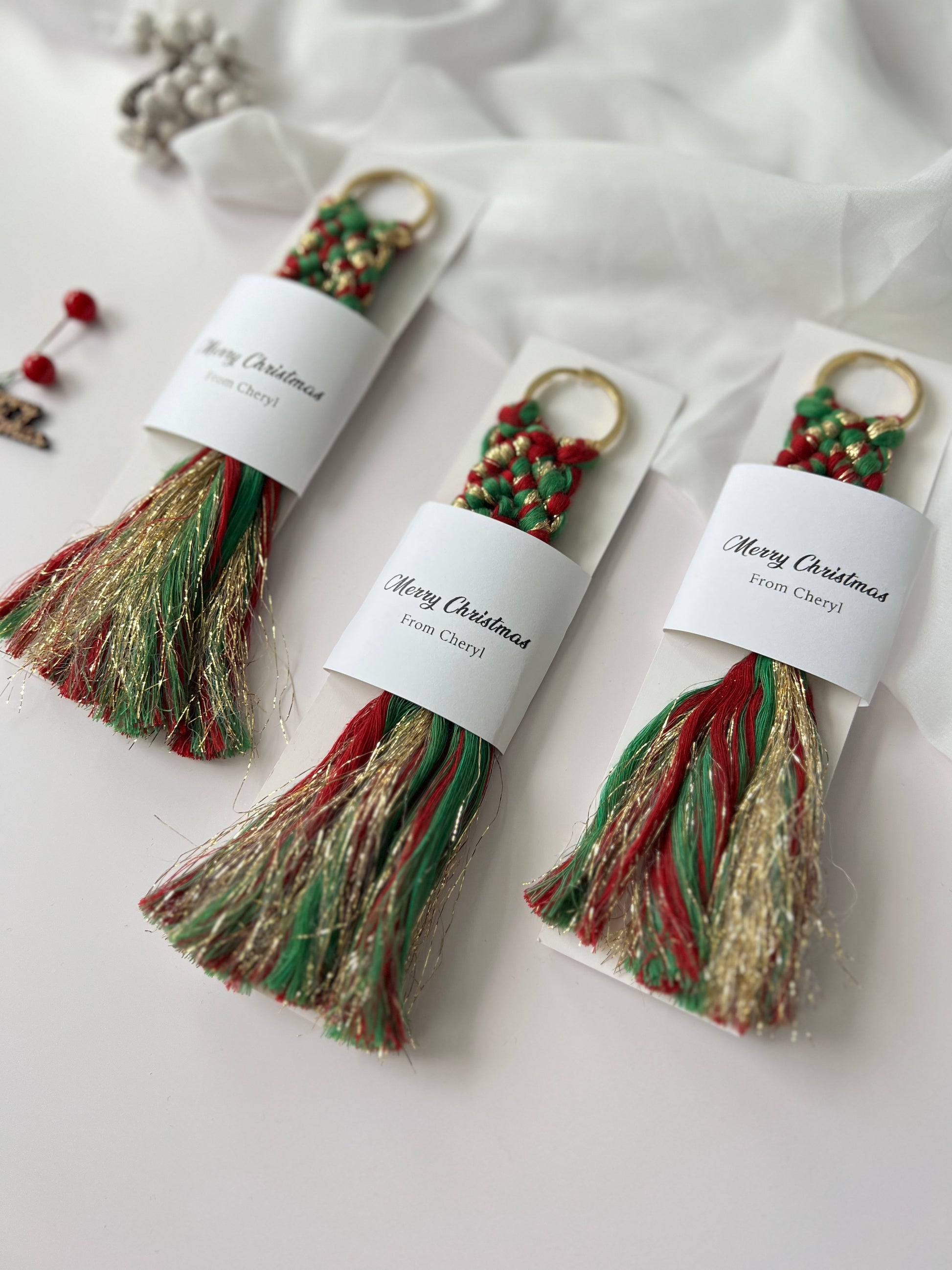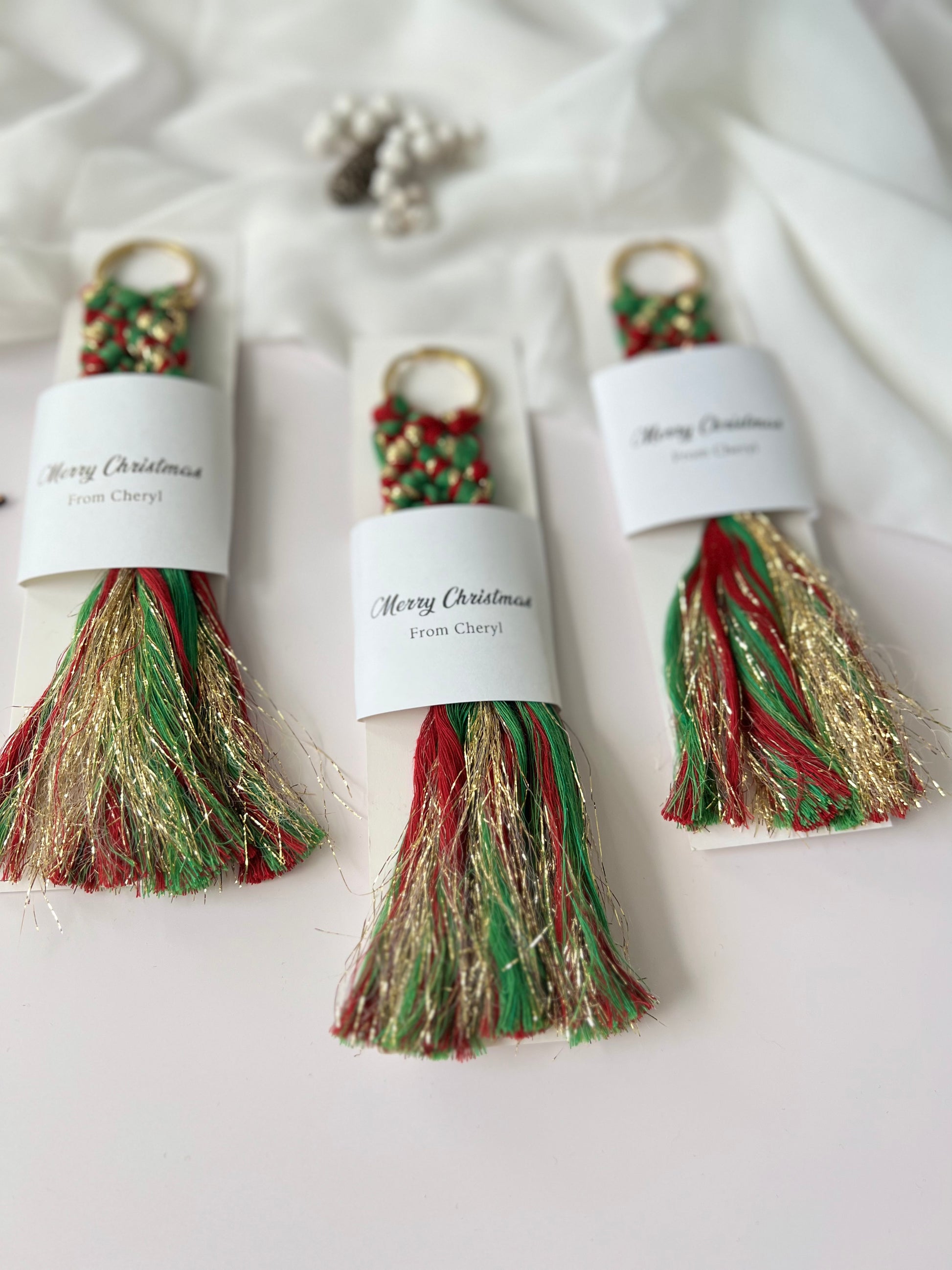 Christmas Keychain Favors for Guests - Personalized Macrame Favors in Red and Gold