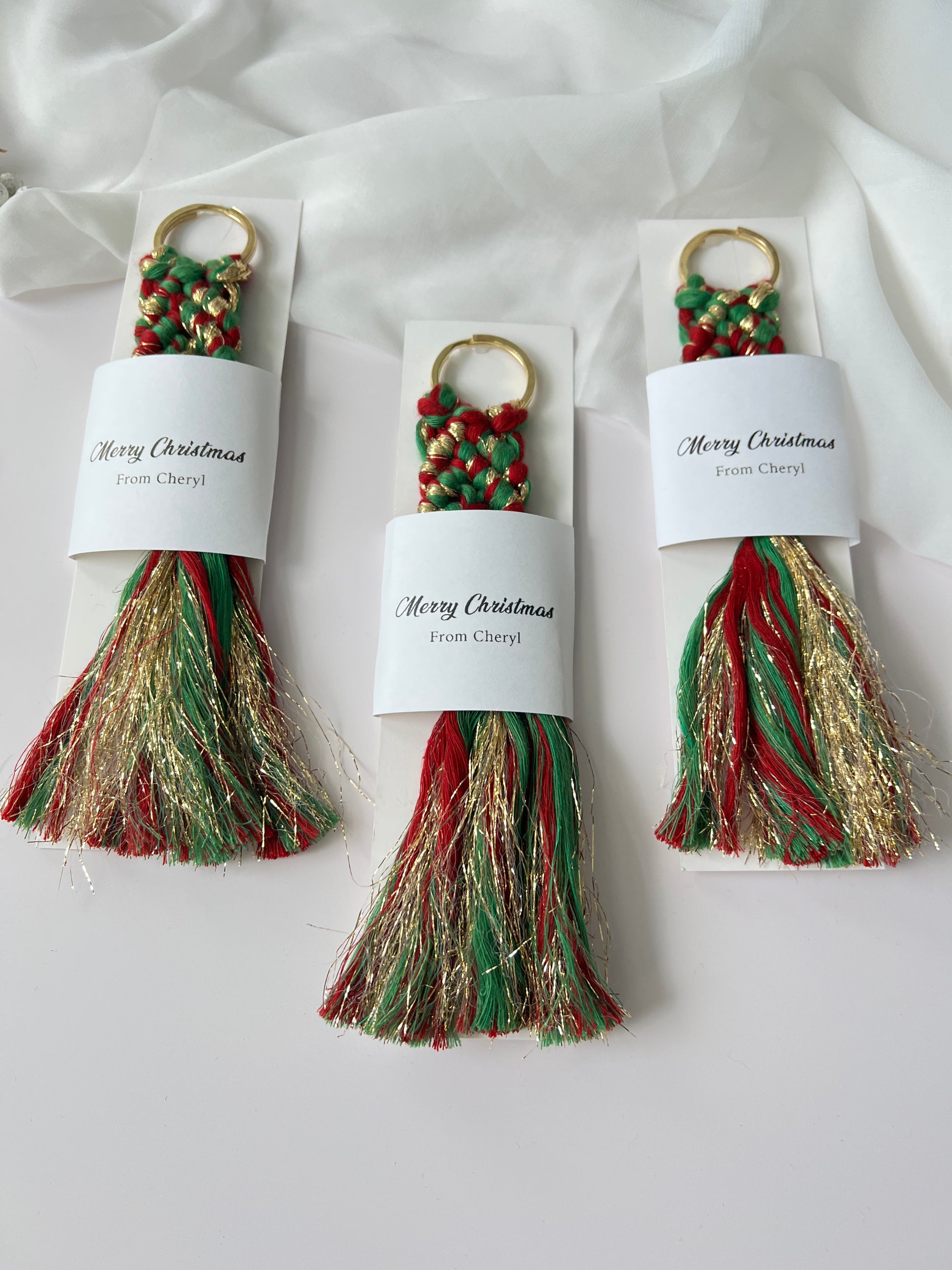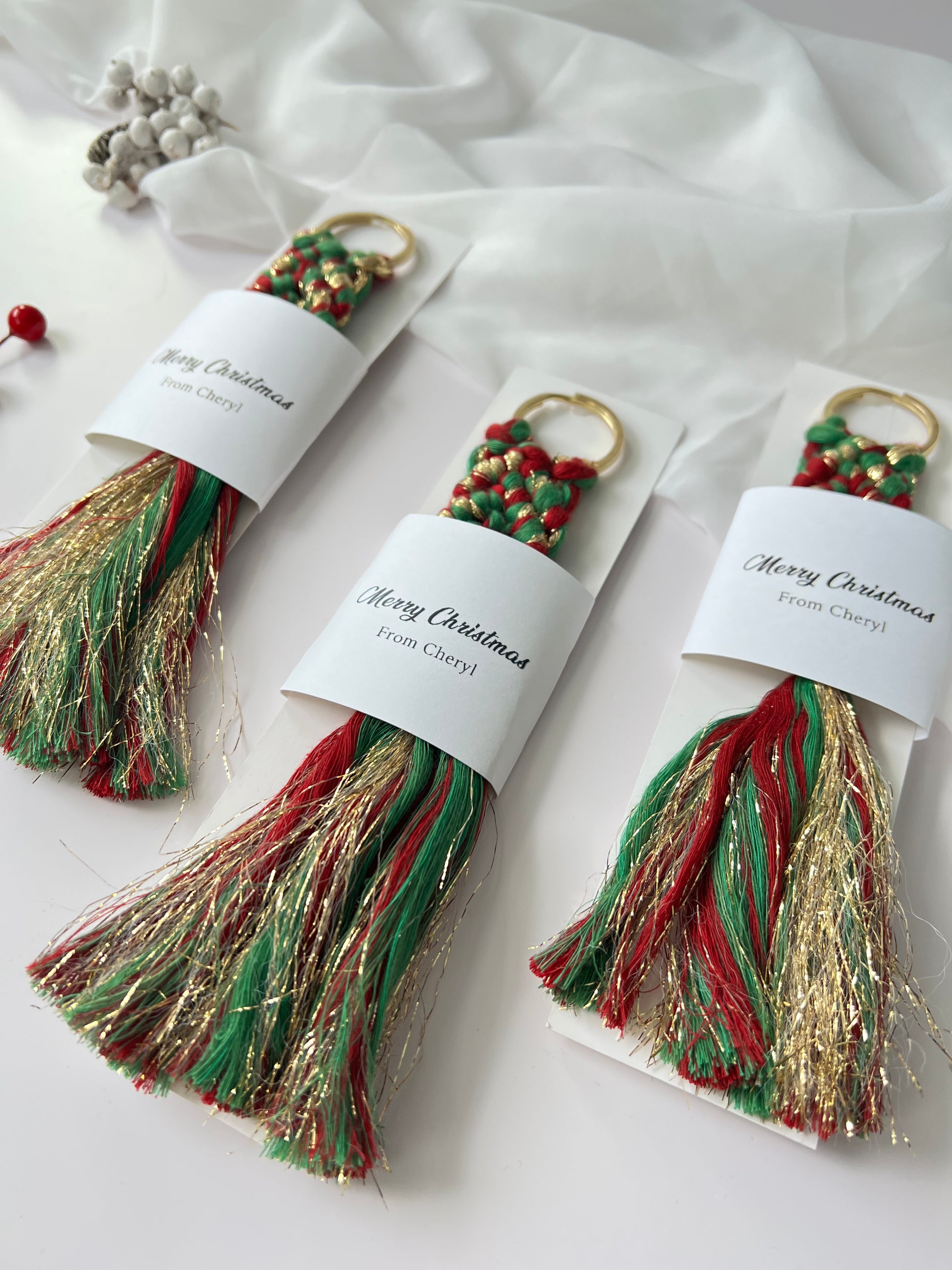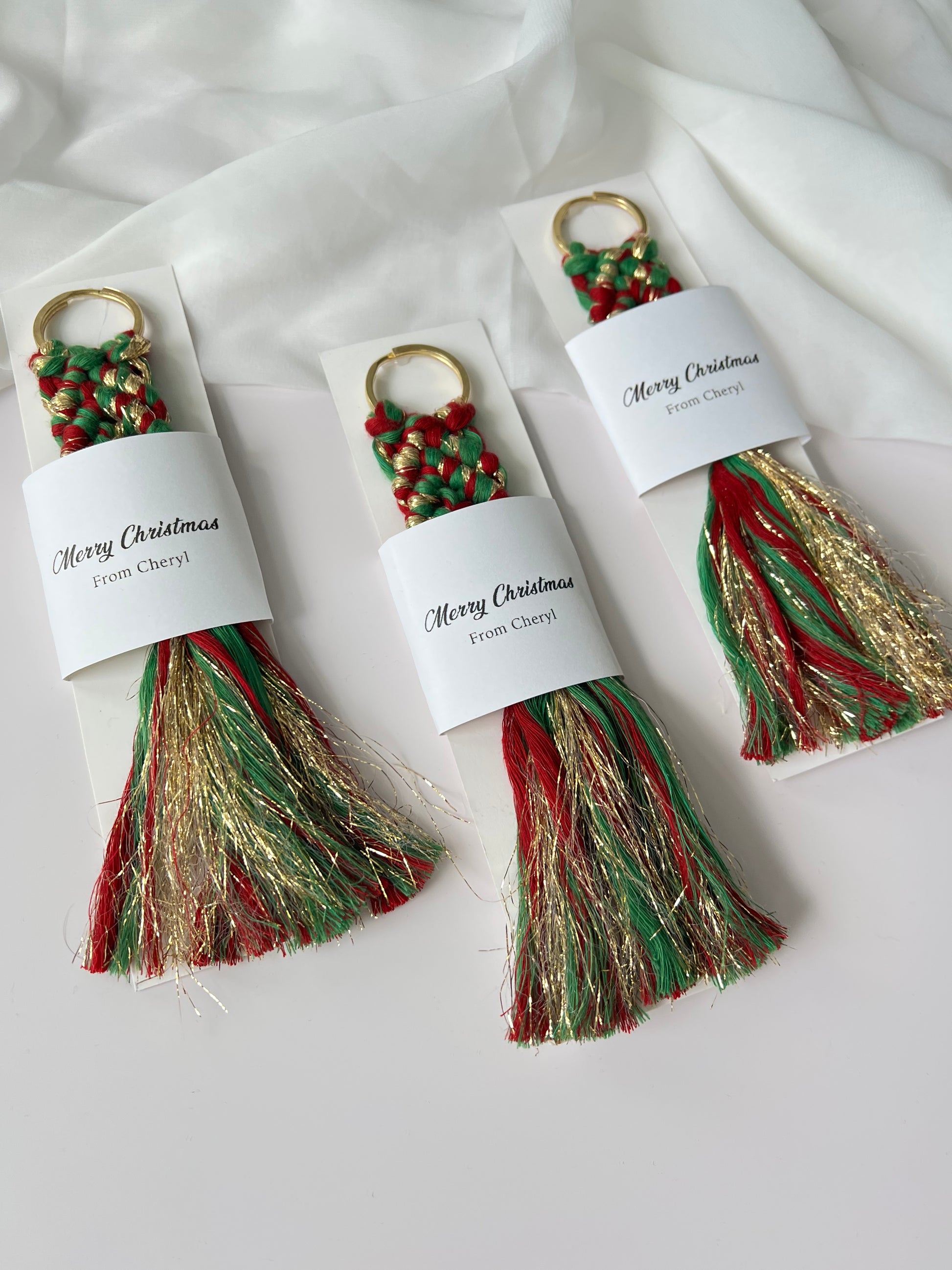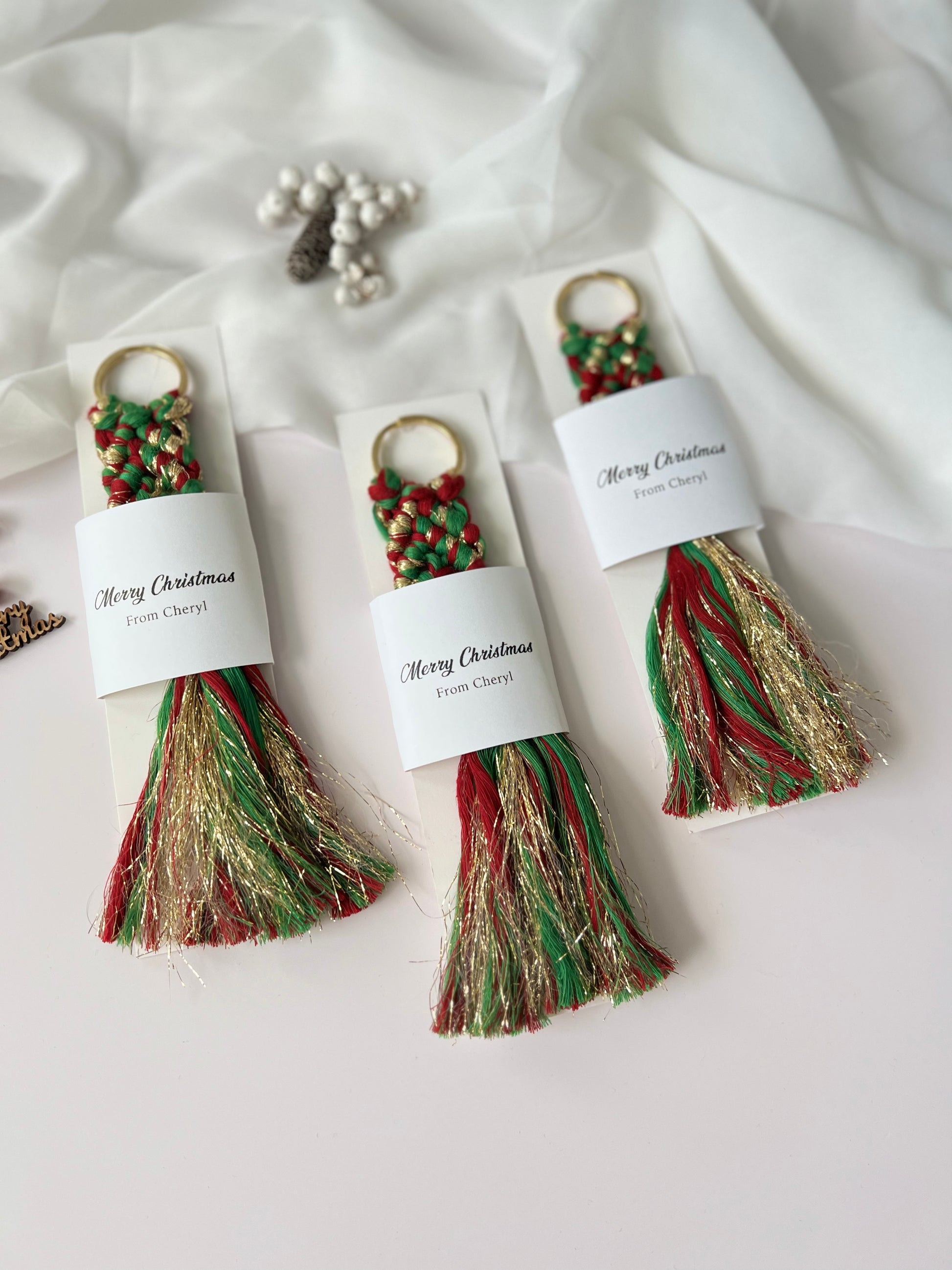 Christmas Keychain Favors for Guests - Personalized Macrame Favors in Red and Gold