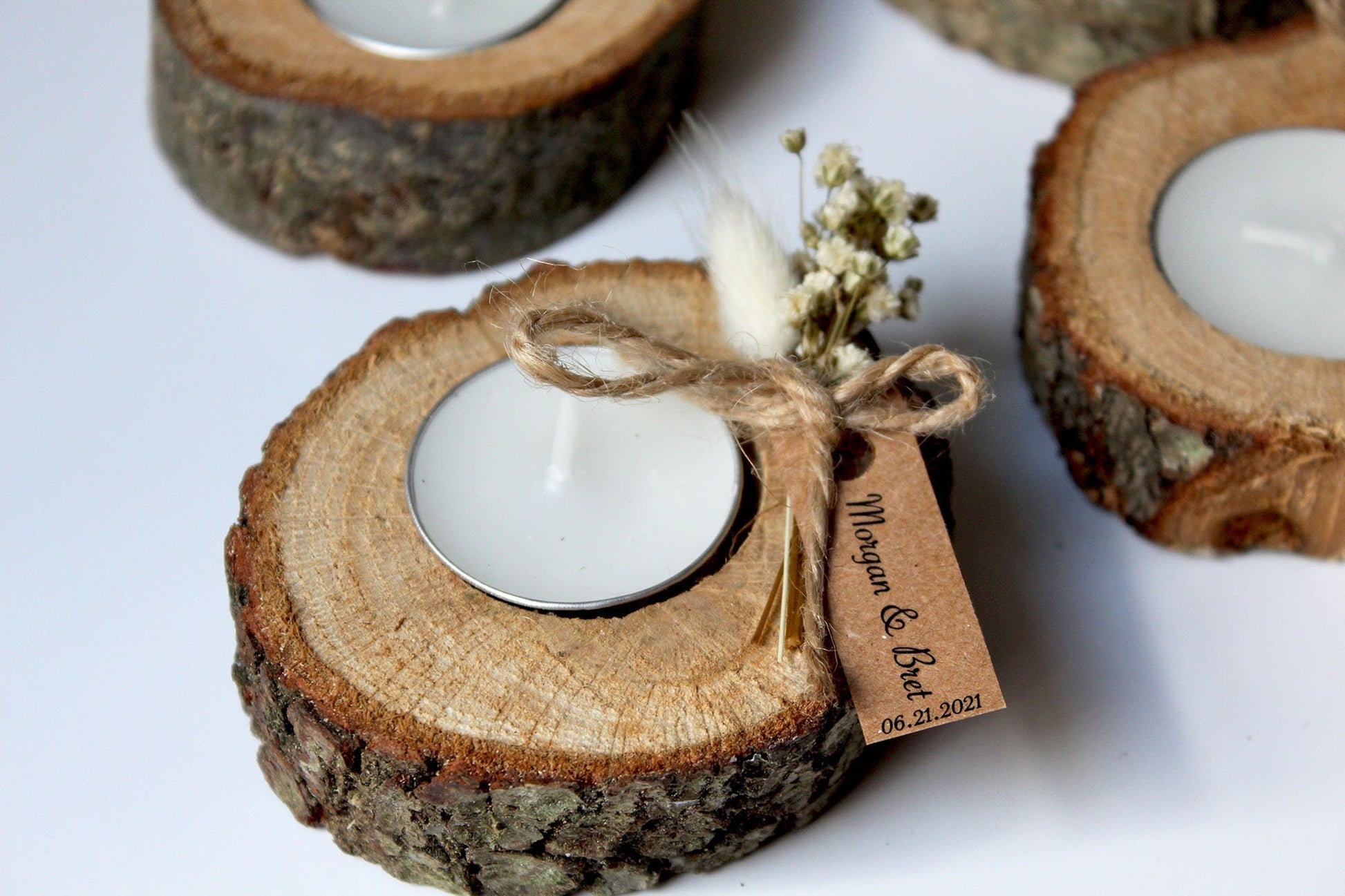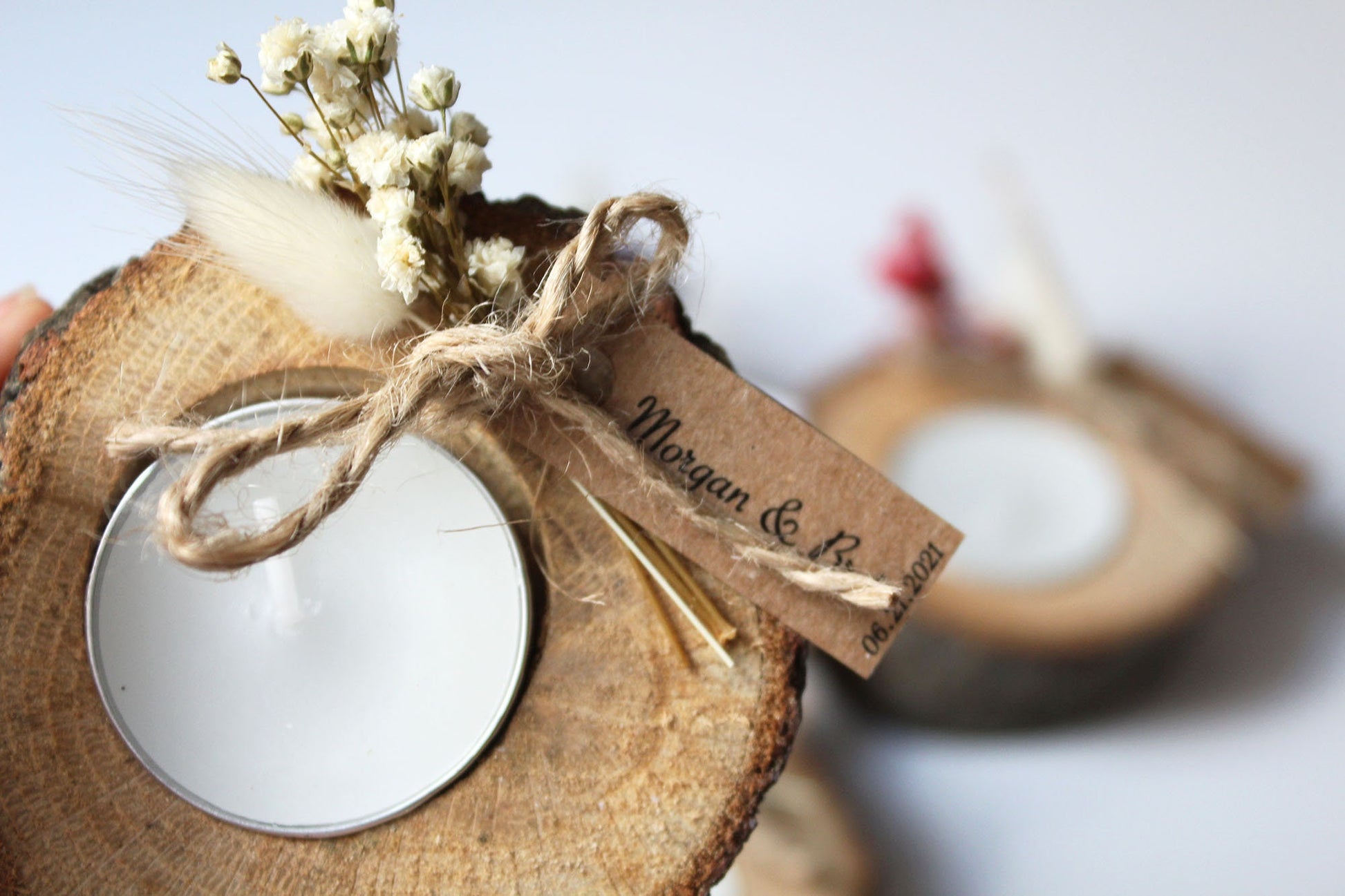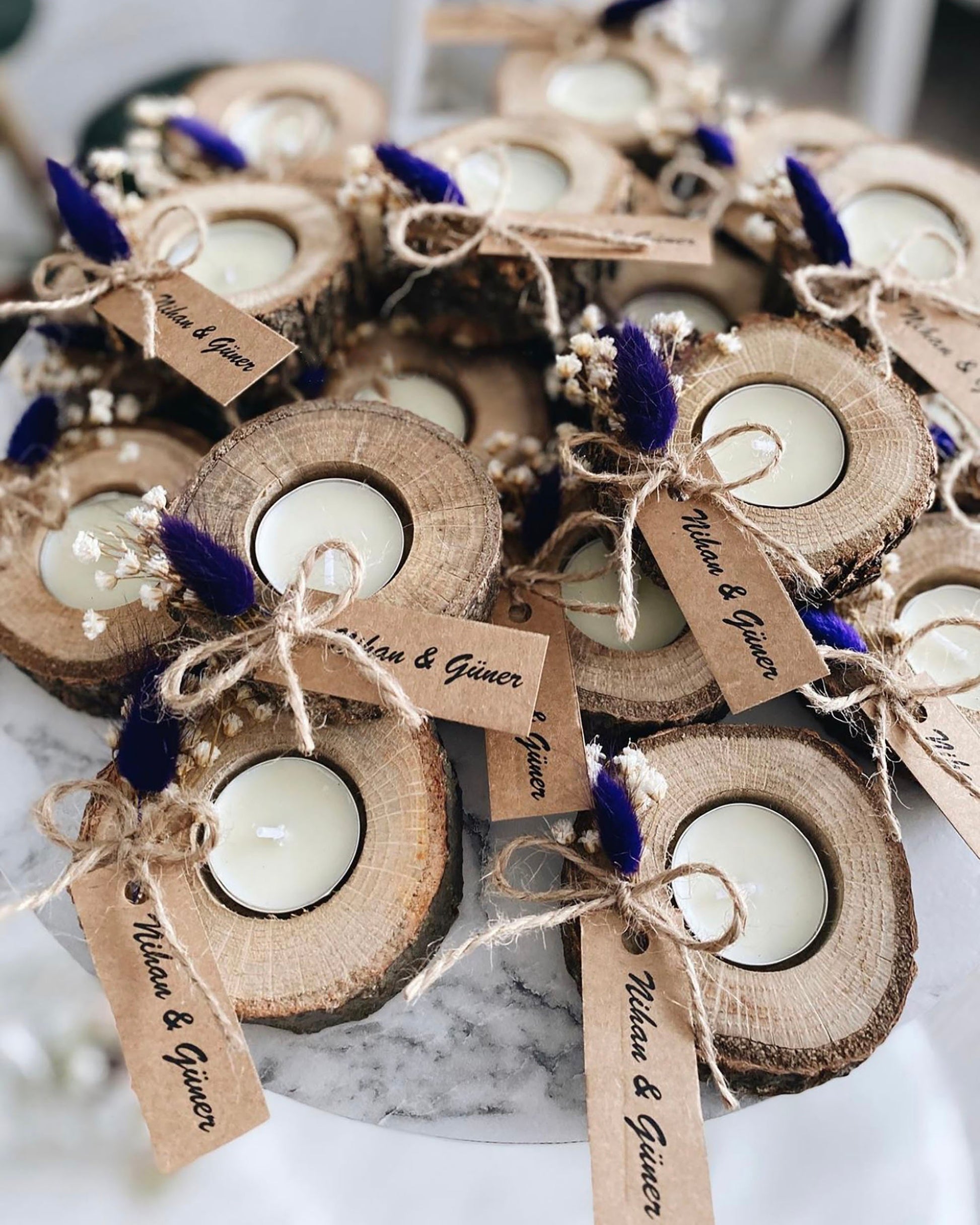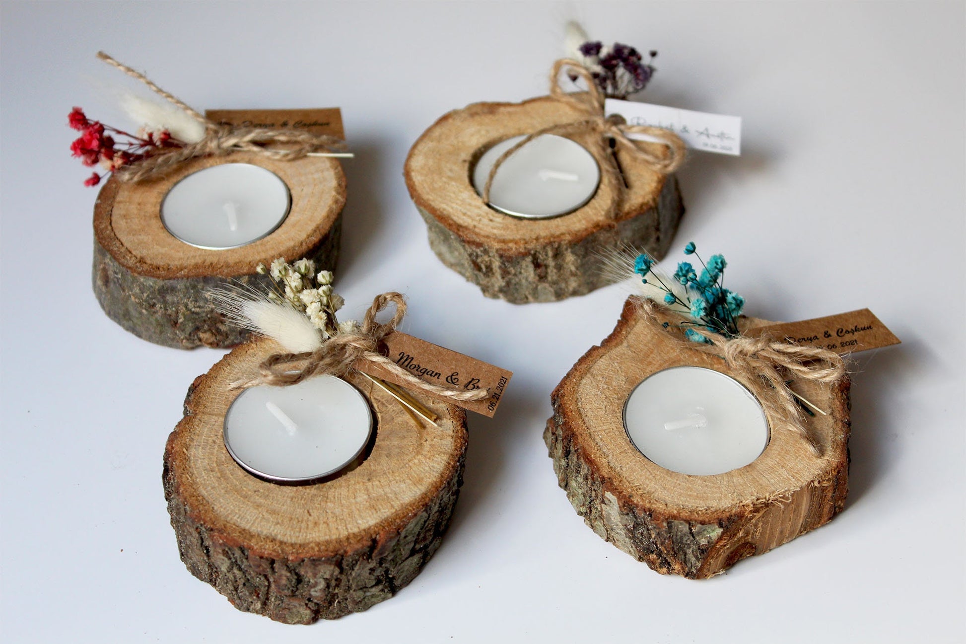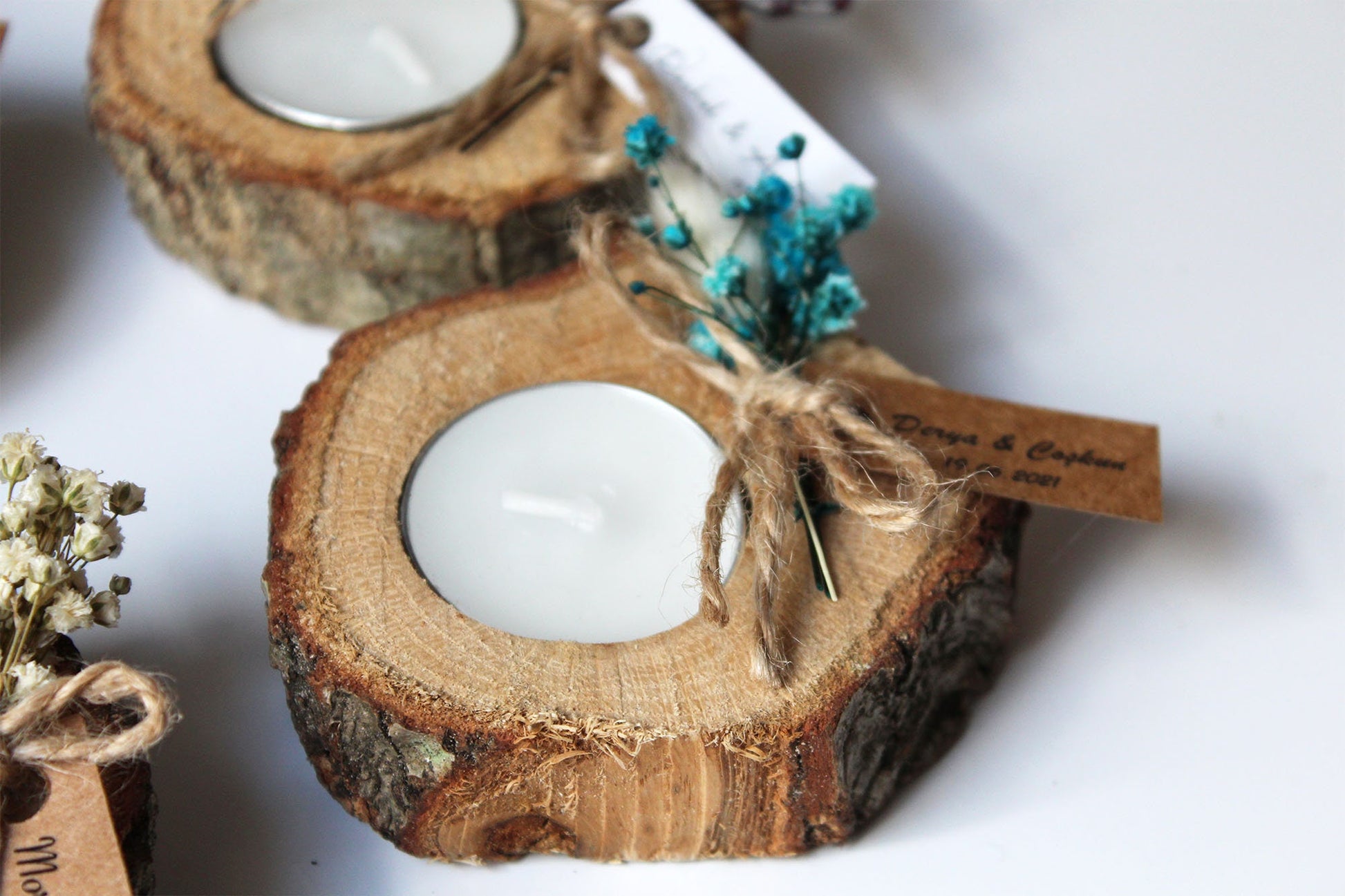 A wooden candle holder decorated with real natural dried flowers and a tealight candle. It is prepared with a personalized brown or white name tag. These gifts are ideal for your rustic-concept party. This items are ideal for, baby shower favors, birthday favors, thank you gifts, bridal shower favors, bridesmaid favors, unique gifts for guests.