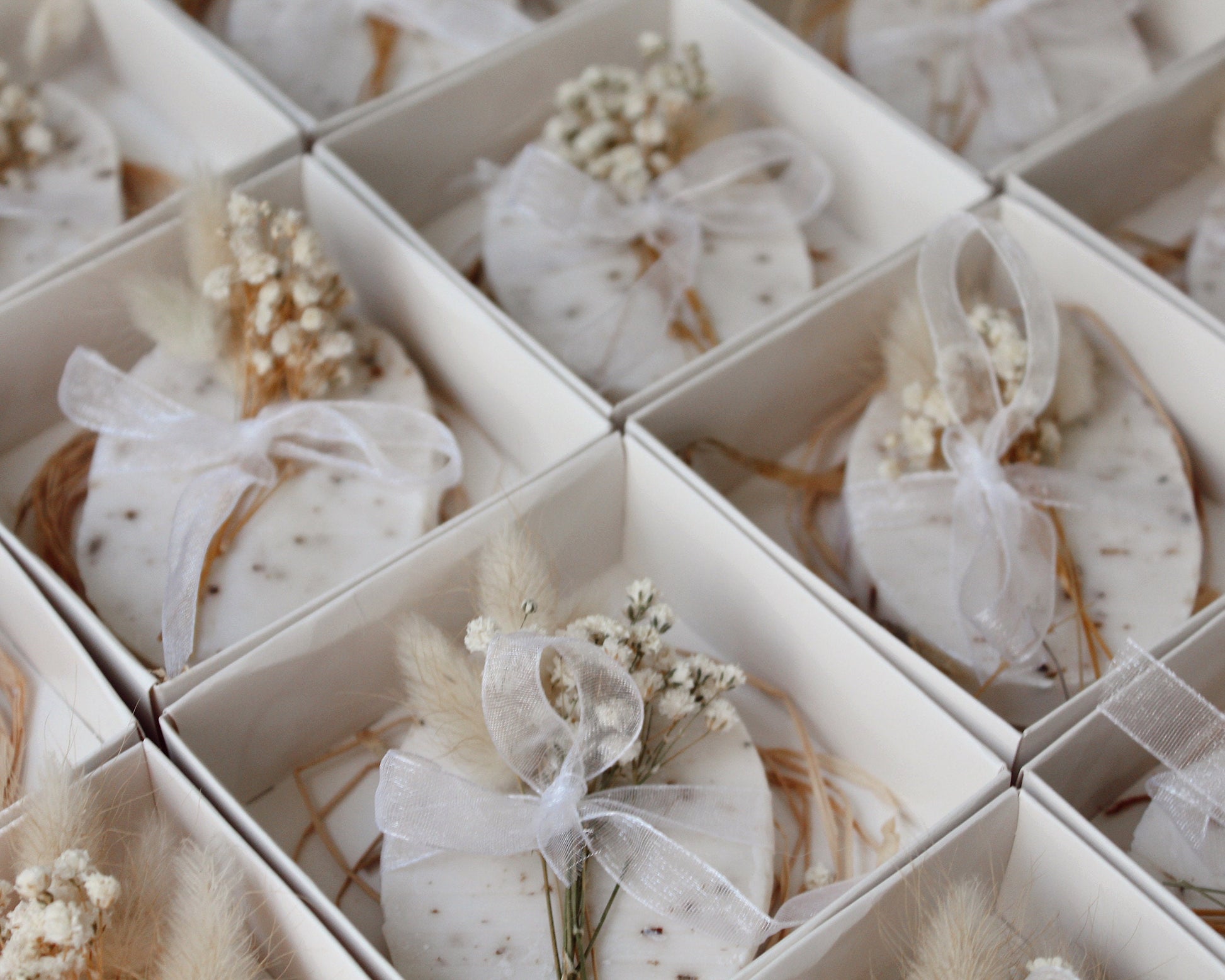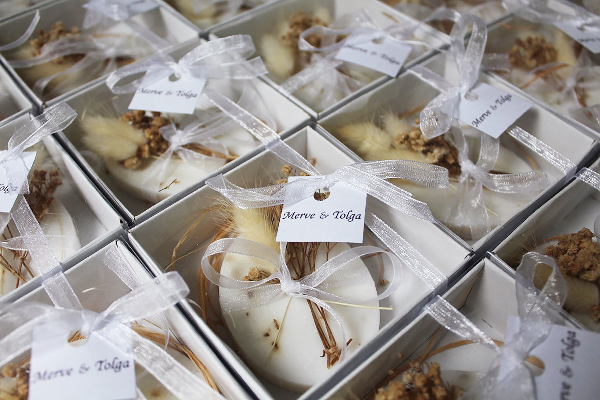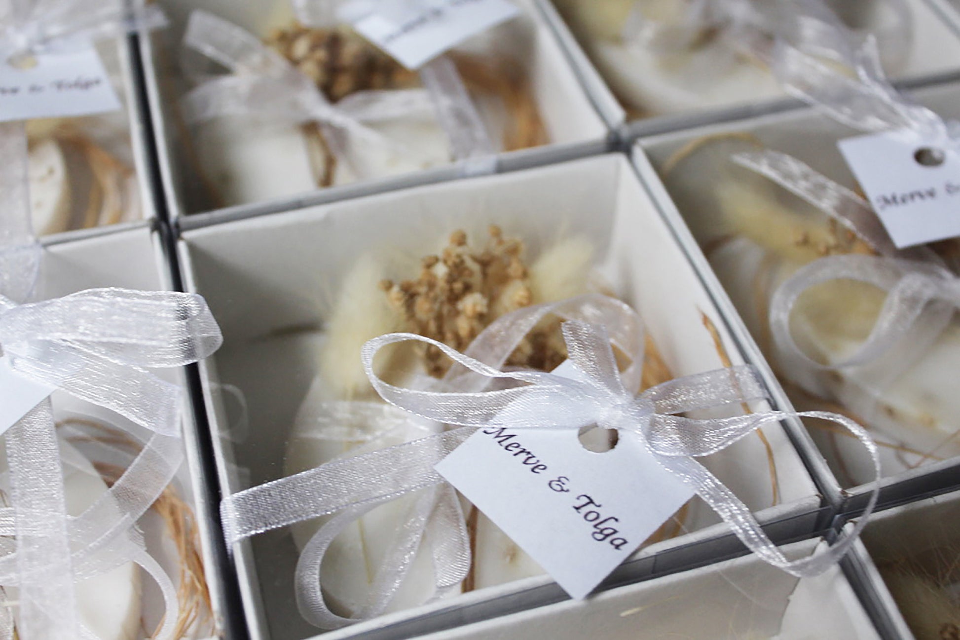 These wedding gifts are ideal for your rustic-concept weddings. These soaps are is designed with straw string and real dried red gypsophila flowers in a craft box. You can choose with or without a personalized name tag.