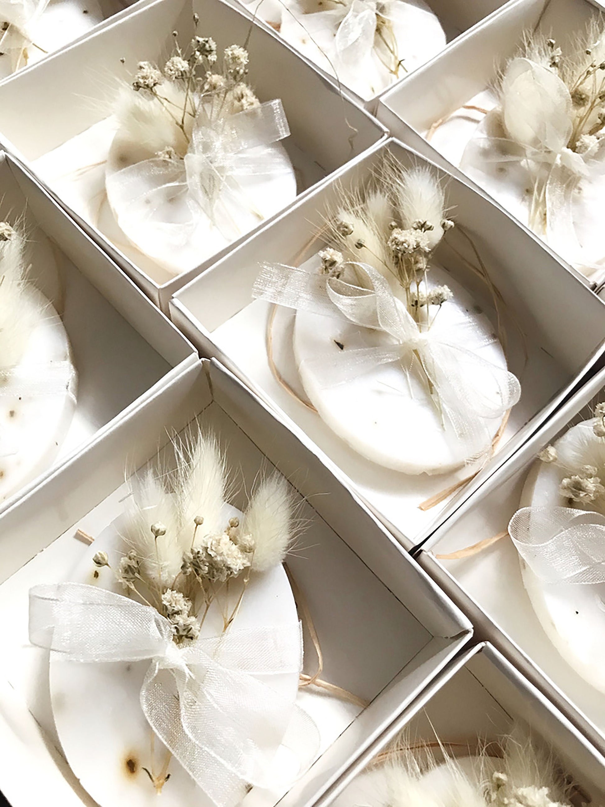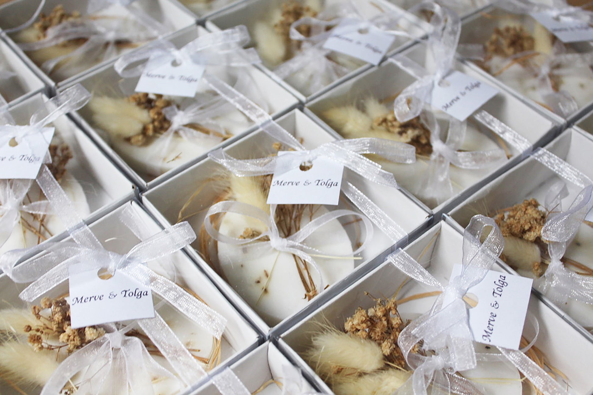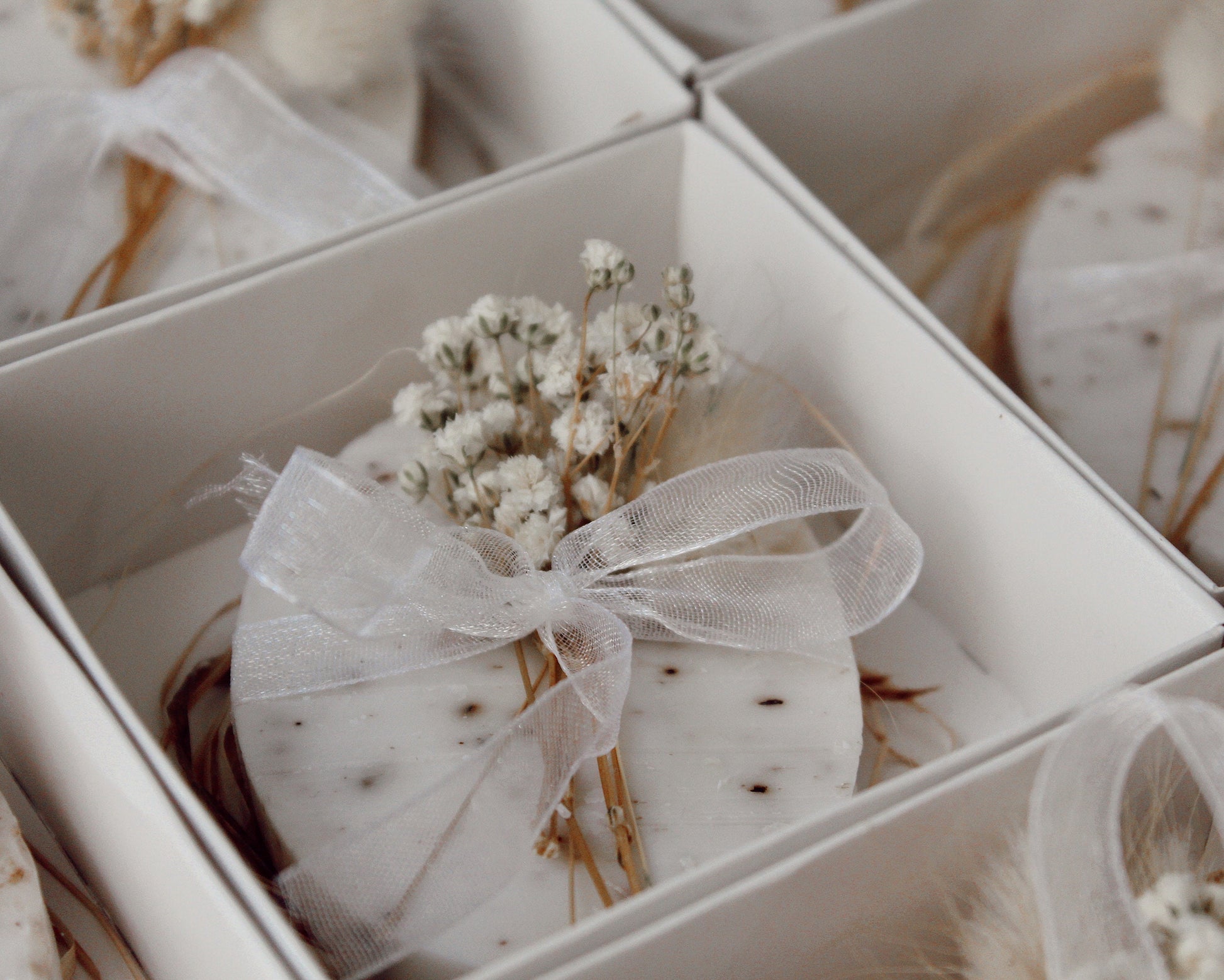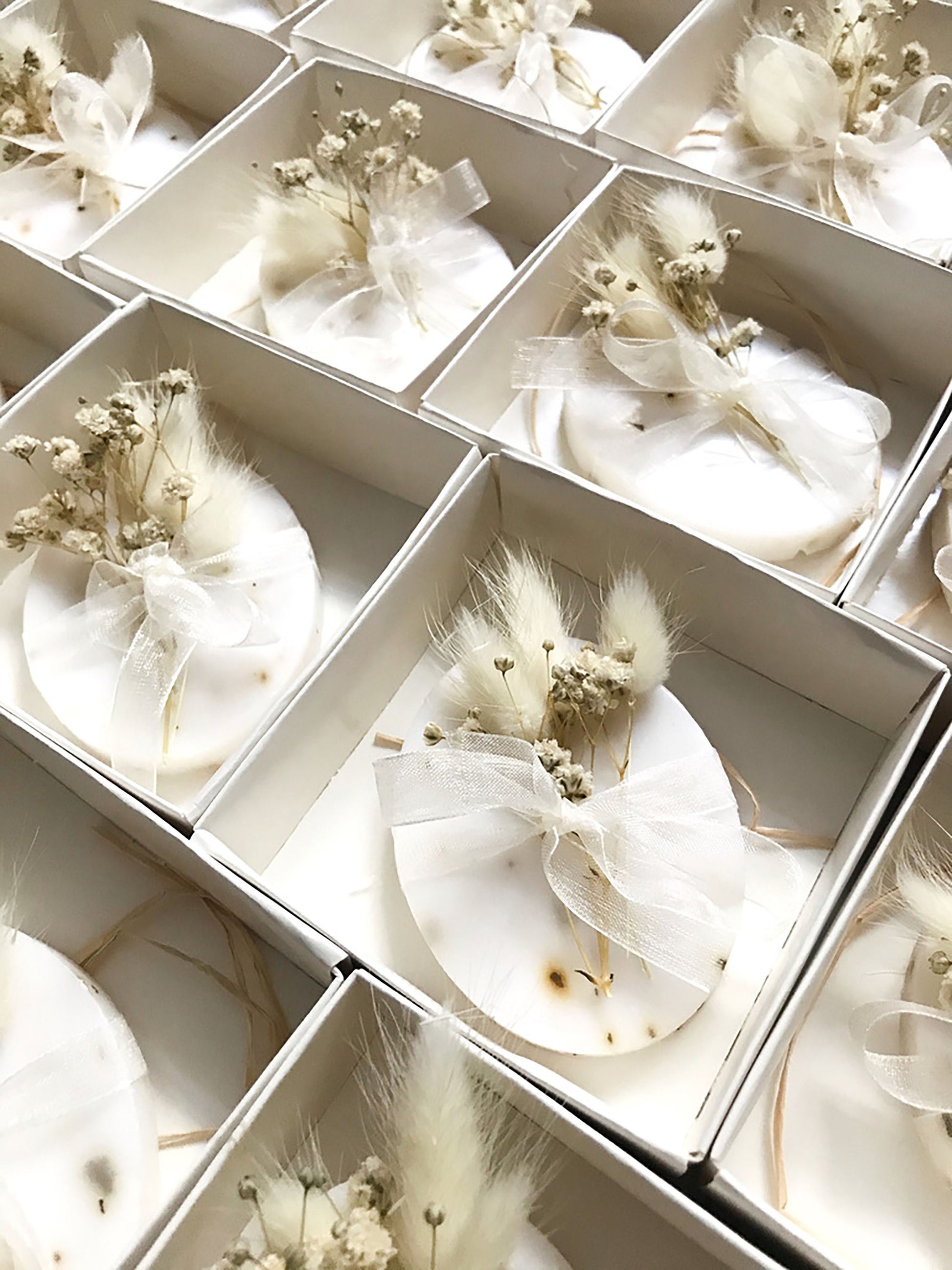 These wedding gifts are ideal for your rustic-concept weddings. These soaps are is designed with straw string and real dried red gypsophila flowers in a craft box. You can choose with or without a personalized name tag.