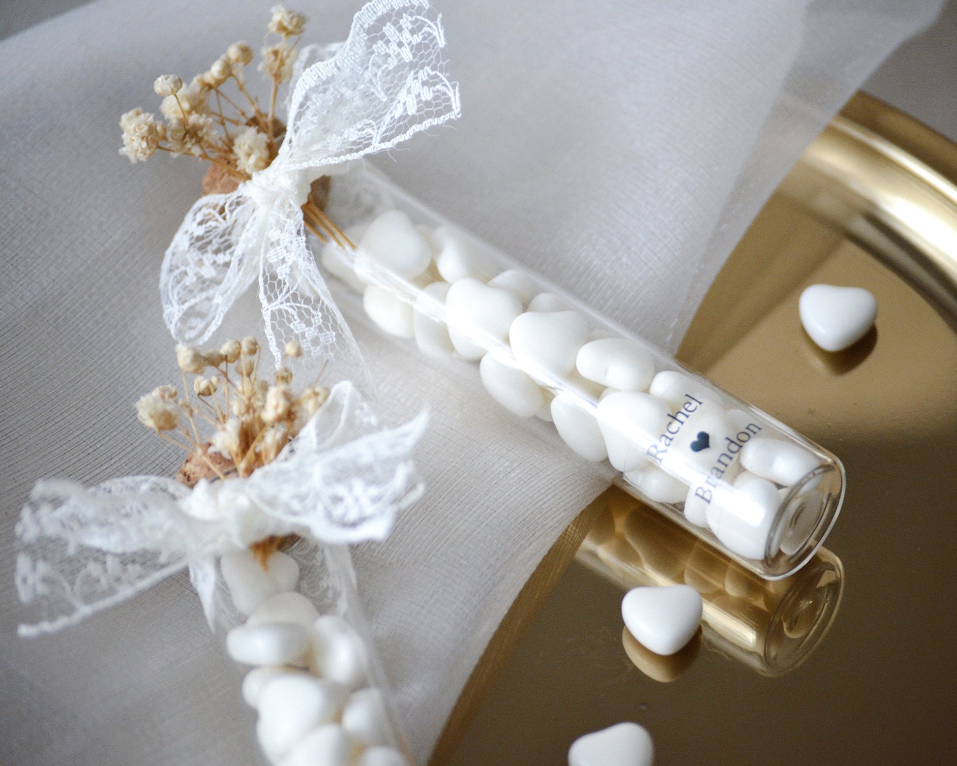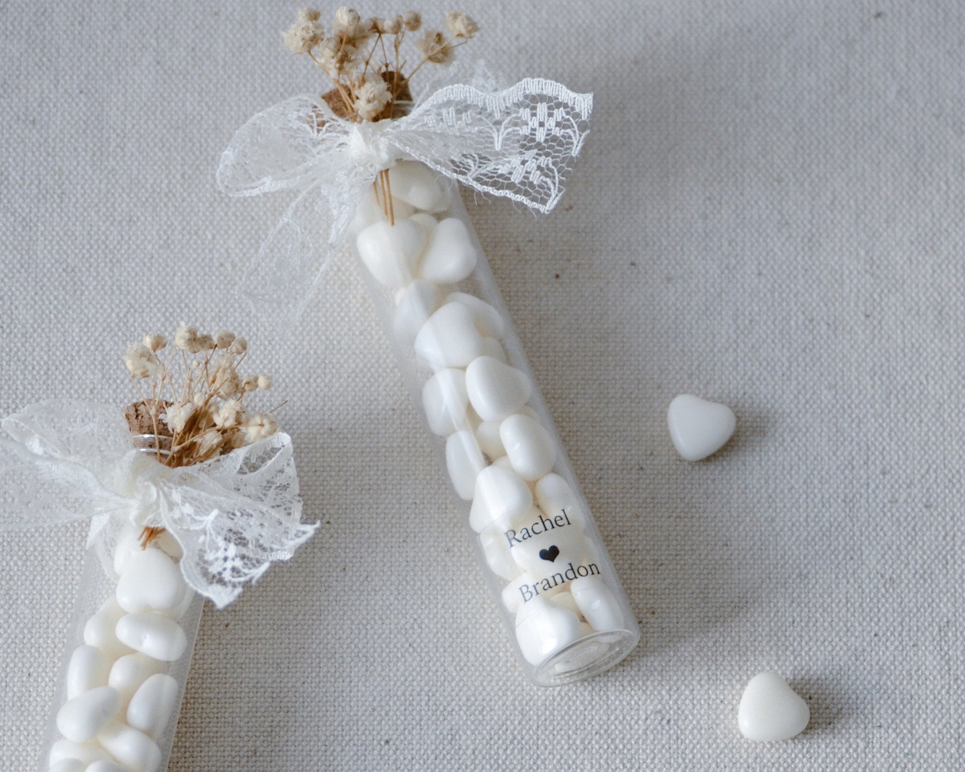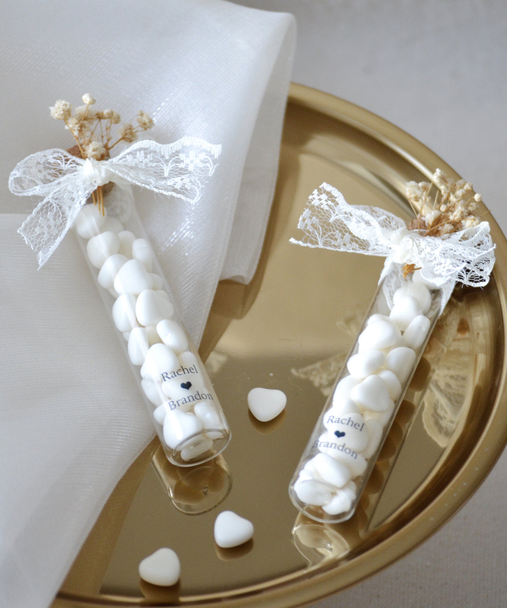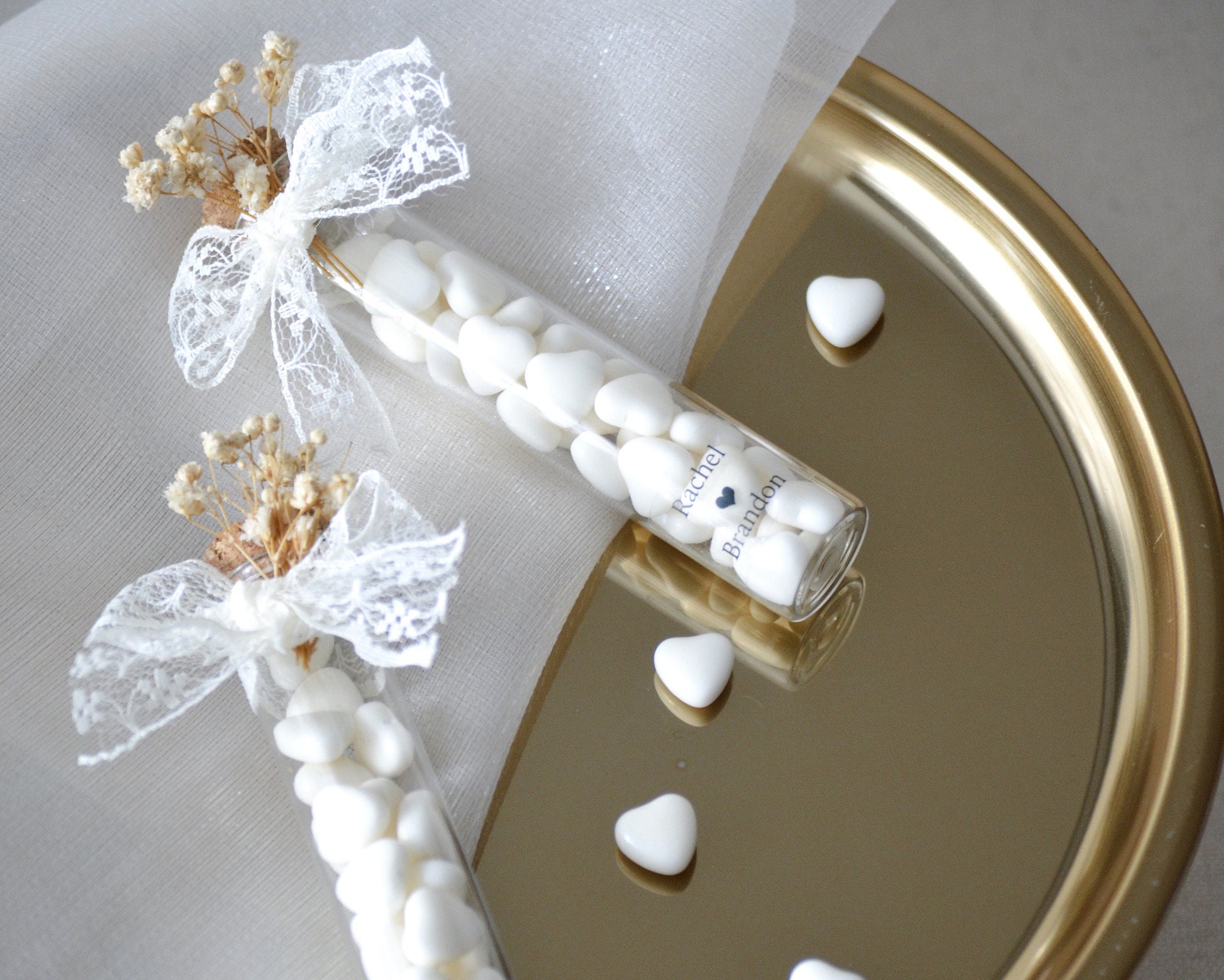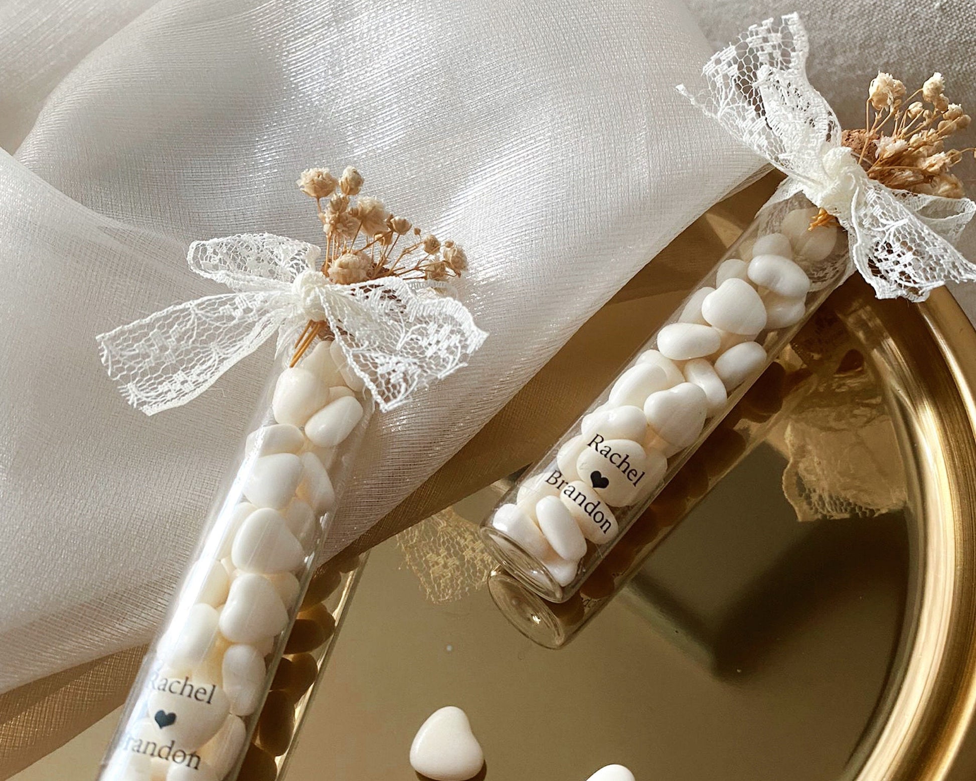 Would you like to give a personalized souvenir favors to your guests at your wedding invitations? This bottle of candy gift is just for you! Heart shaped candies tell your love for the guests! A personalized guest favor you can choose for your rustic, elegant, boho and many more special events. You can use it as a thank you gift for wedding, engagement, wedding shower, bridal shower, bridesmaid favors, party favors.